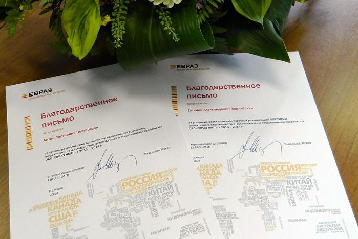 Представитель компании ООО «ЕвразХолдинг» Фёдор Фадеенко вручил профессору кафедры управления персоналом и трудового права и кафедры философии и психологии Евгению Могилёвкину и старшему преподавателю кафедры управления персоналом и трудового права Антону Новгородову благодарственные письма «За успешную реализацию долгосрочной развивающей программы эффективного взаимодействия руководителей и представителей профсоюзов ОАО «Евраз НМТП» в 2013-2014 гг.»
