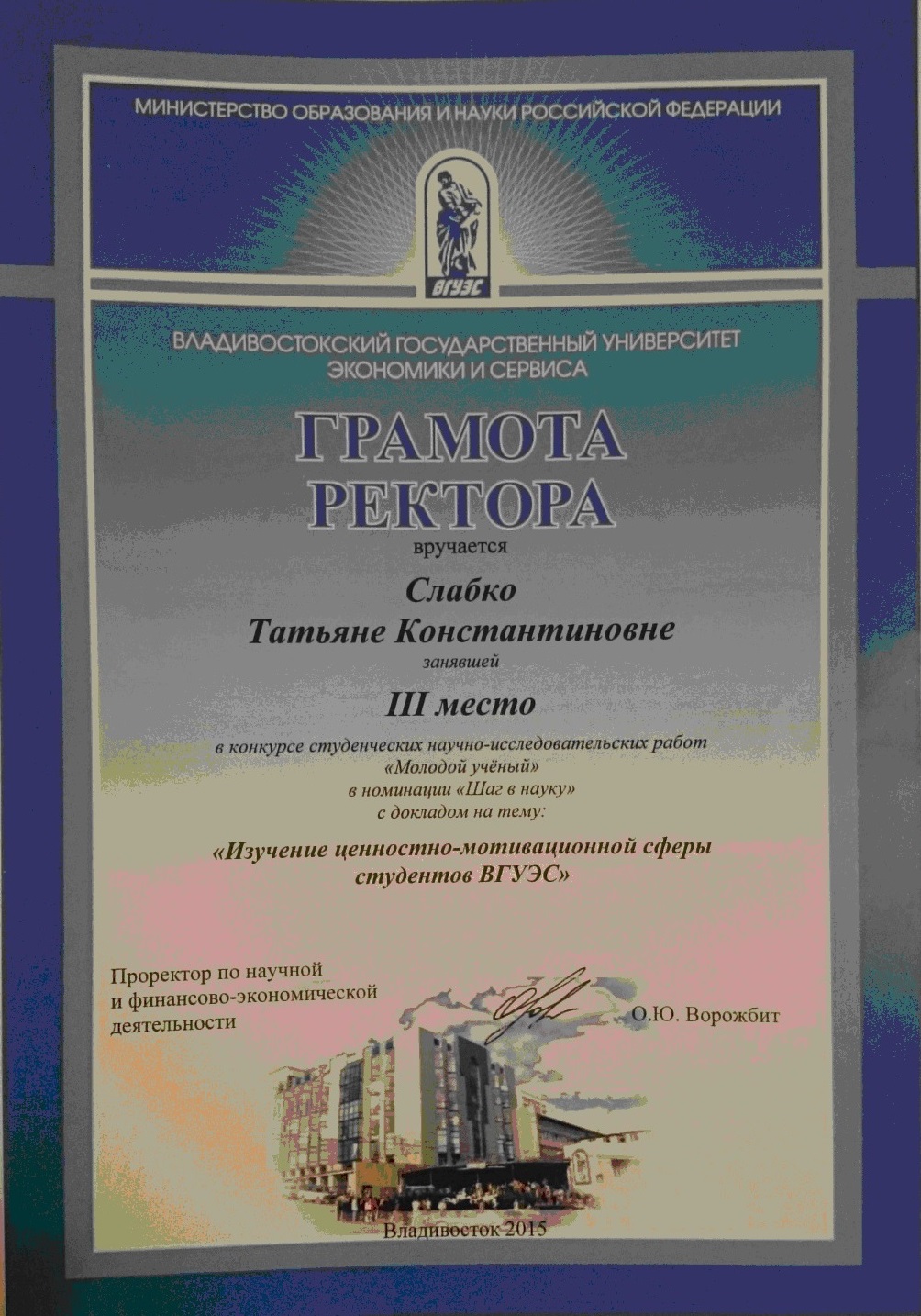 Слабко Татьяна Константиновна студентка 3 курса, обучающаяся по направлению психология, кафедра философии и юридической психологии в ноябре 2015 года принимая участие в конкурсе студенческих научно-исследовательских работ «Молодой ученый» и заняла 3 место в номинации «Шаг в науку». Тема работы: «Изучение мотивационной сферы студентов с разными уровнями адаптации к вузу», научный руководитель доктор пед. наук, профессор Чернявская Валентина Станиславовна.