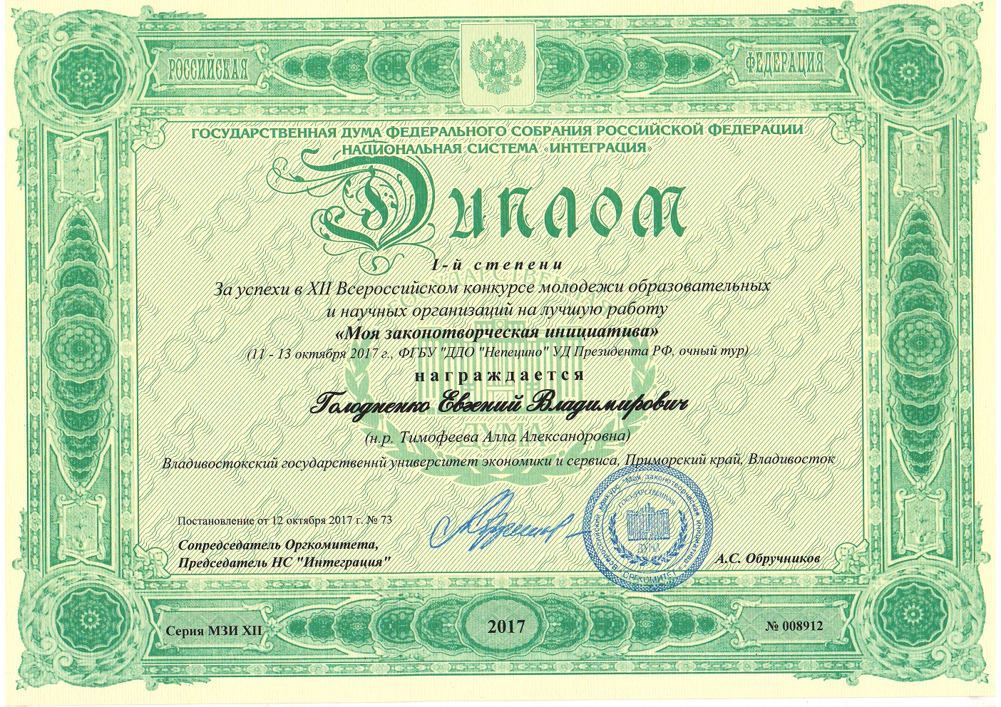 В период с 11 по 13 октября 2017 года в д/о «Непецино» Управления делами Президента Российской Федерации состоялся XII Всероссийский конкурс молодежи образовательных и научных организаций на лучшую работу «МОЯ ЗАКОНОТВОРЧЕСКАЯ ИНИЦИАТИВА»