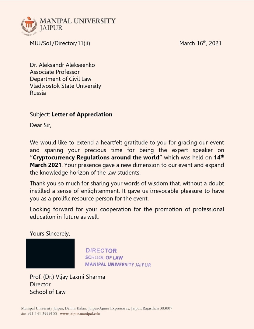 По приглашению коллег из School of Law, Manipal University Jaipur доцент кафедры ГПД Александр Алексеенко выступил с лекцией по вопросам цифровизации и инвестиций перед индийскими студентами.
