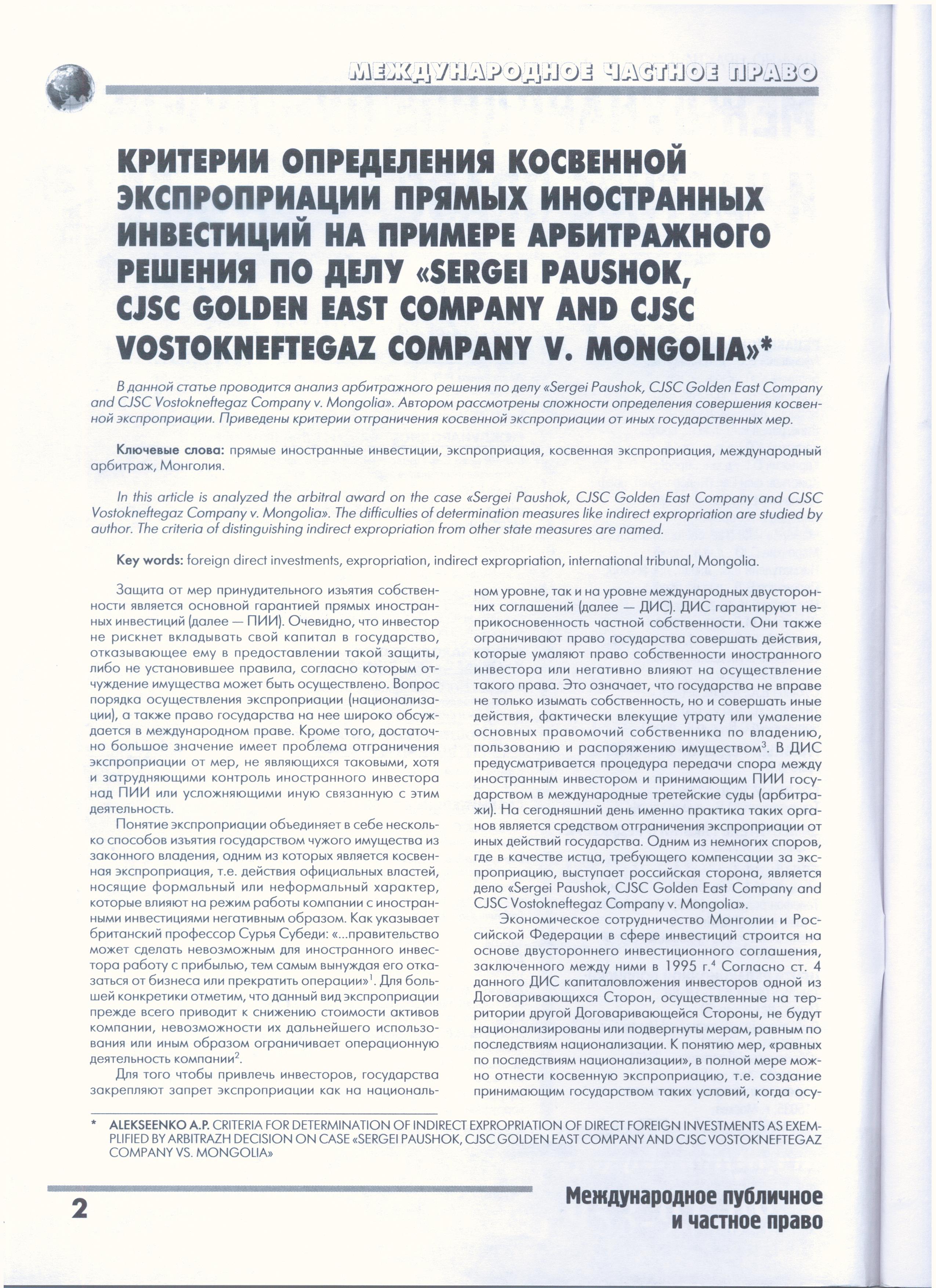 Критерии определения косвенной экспроприации прямых иностранных инвестиций на примере арбитражного решения по делу «Sergei Paushok, CJSC Golden East Company and CJSC Vostokneftegaz Company v. Mongolia»
