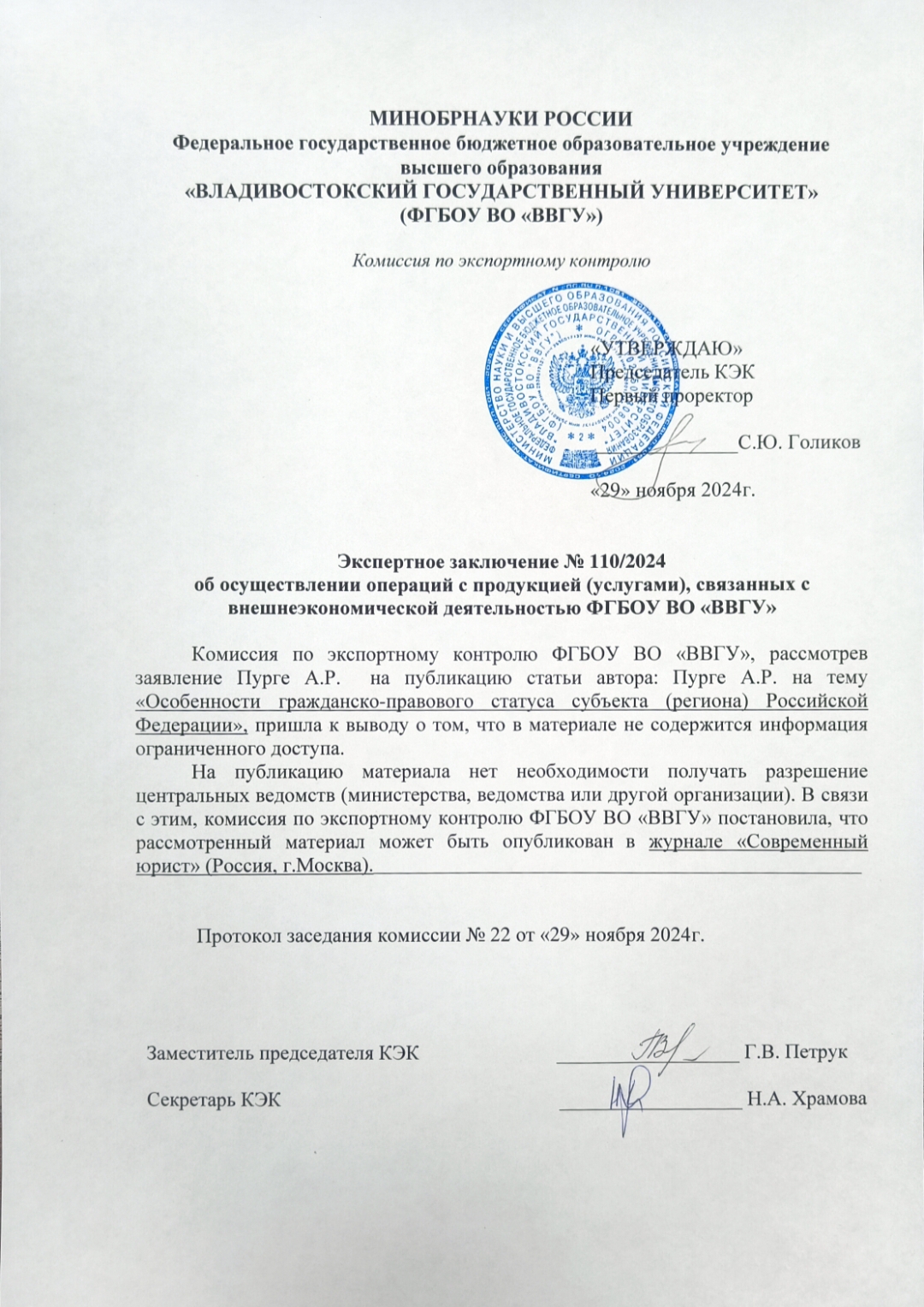 Особенности гражданско-правового статуса субъекта (региона) Российской Федерации